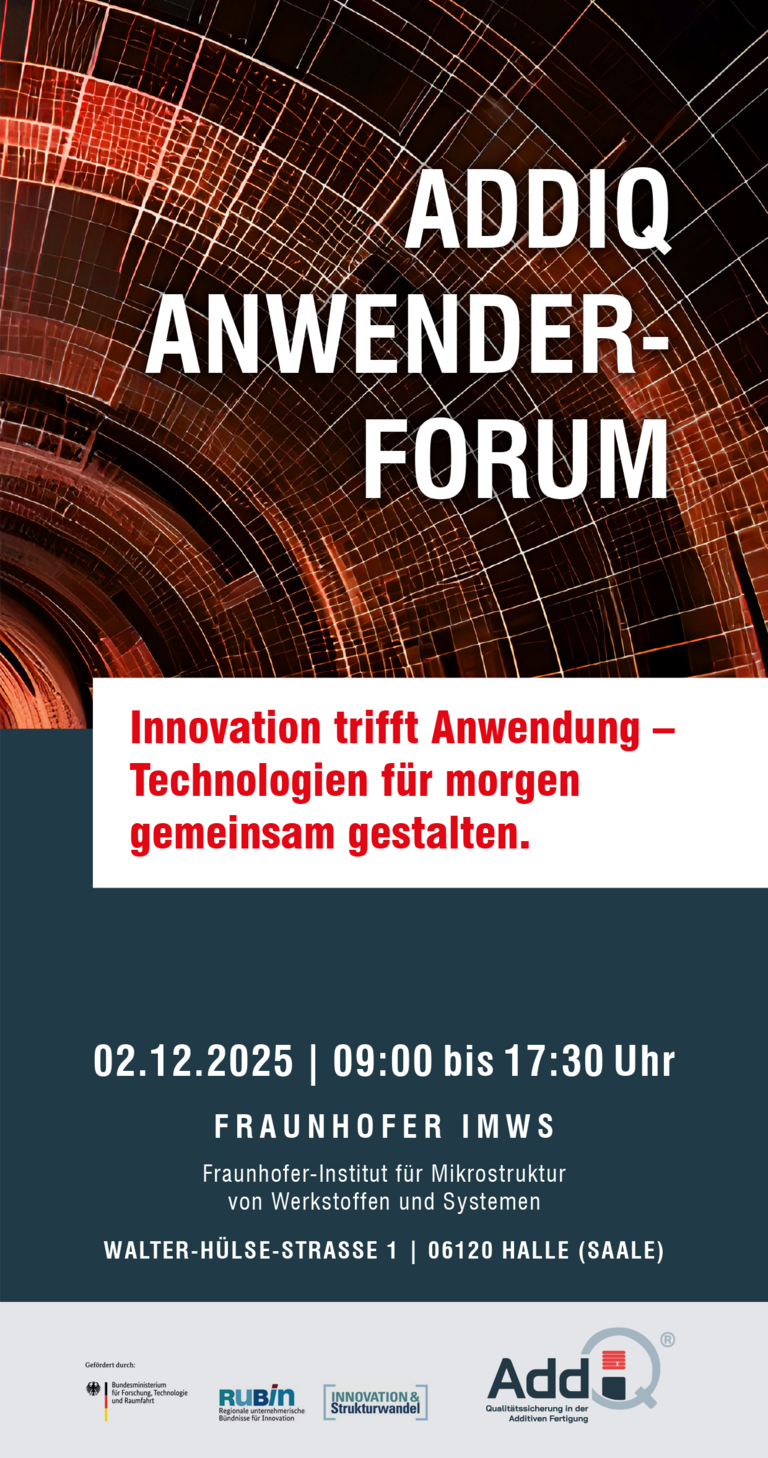 Am 2. Dezember 2025 lädt das AddiQ-Konsortium zum großen Anwenderforum 2025 nach Halle (Saale) ein. Unter dem Motto „Qualitätssicherung in der Additiven Fertigung – Innovation trifft Anwendung“ treffen sich ExpertInnen, EntwicklerInnen und AnwenderInnen aus Industrie und Forschung am Fraunhofer-Institut für Mikrostruktur von Werkstoffen und Systemen (IMWS) auf dem Weinberg-Campus. Das Anwenderforum bietet einen Tag voller spannender Impulse, praxisnaher Einblicke und lebhafter Diskussionen rund um die Qualitätssicherung additiver Fertigungsverfahren. Im Mittelpunkt stehen der Austausch zwischen Forschung, Entwicklung und Anwendung sowie konkrete Lösungsansätze entlang der gesamten Prozesskette – von der Datenbasis und Prozessüberwachung bis hin zu Postprocessing, Zertifizierung und Normung.