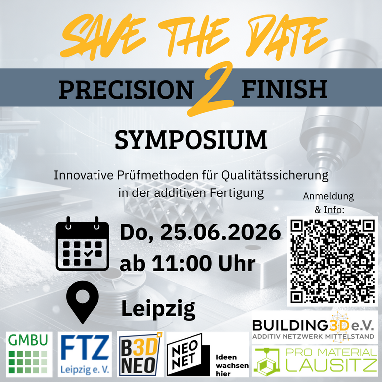 Am 25. Juni 2026 lädt das AddiQ-Bündnis gemeinsam mit neo.NET e.V., building 3d e.V., Cluster B3Dneo, ProMaterialLausitz und FTZ Leipzig e.V. zum Symposium „precision2finish“ nach Leipzig ein.